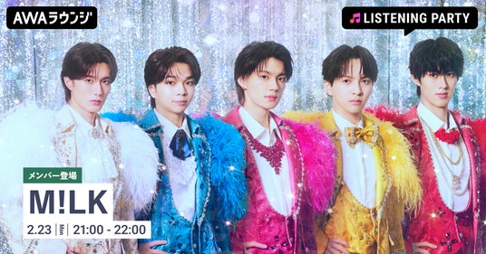 AWA株式会社(本社:東京都港区、代表取締役CEO:冨樫晃己)が運営する、サブスクリプション型(定額制)音楽ストリーミングサービス「AWA(アワ)」は、2026年2月23日(月) 21:00~22:00の1時間に渡り、無料で誰でも参加できるオンライン空間「AWAラウンジ」で、M!LKのメンバーがチャットで登場するリスニングパーティーを開催いたします。
