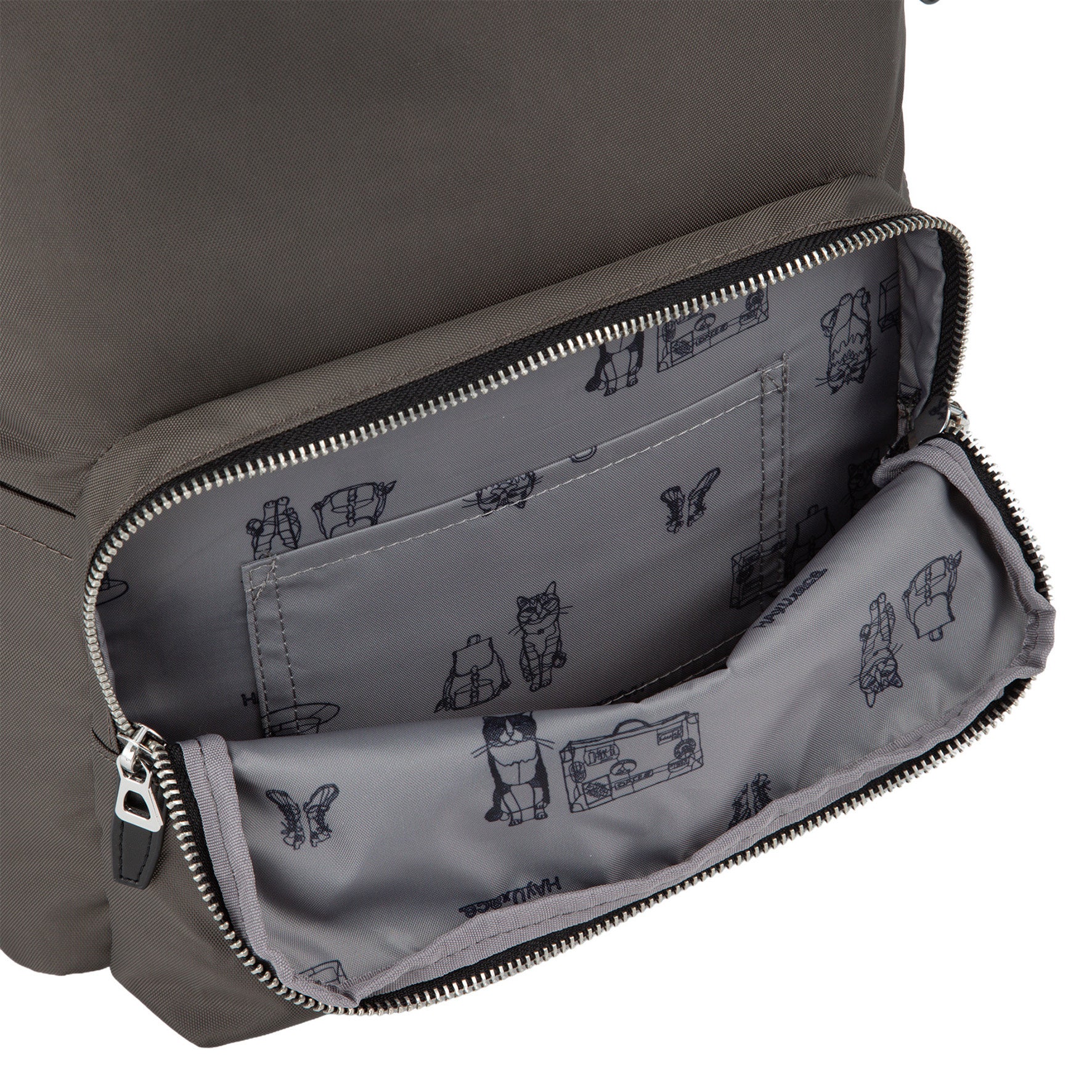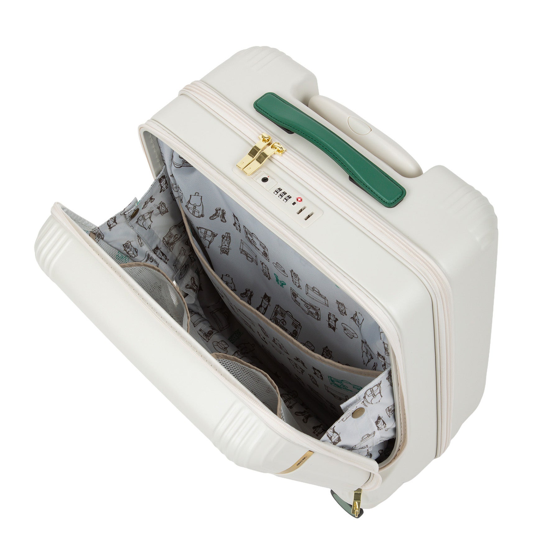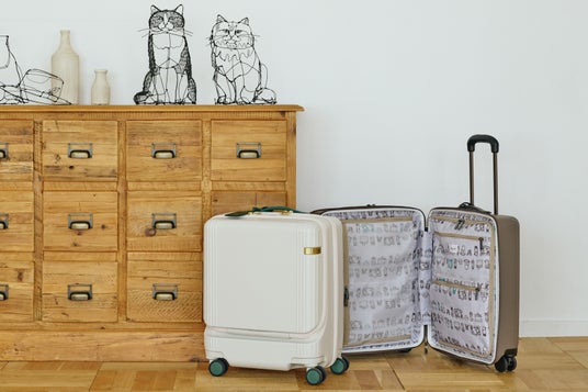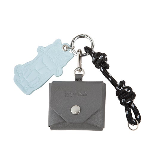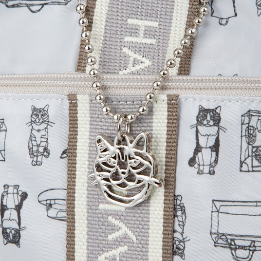 シンプルなデザインに、猫のキーホルダーやマルチケースなどの大ぶりチャームが遊び心を添えています。内装にはキュートな猫柄の生地を採用しました。さらに、折り畳み傘などの収納に便利な吸水速乾メッシュポケットや、スーツケースのプルドライブハンドルに固定できるセットアップベルトなど、旅を快適にサポートする機能を備えています。