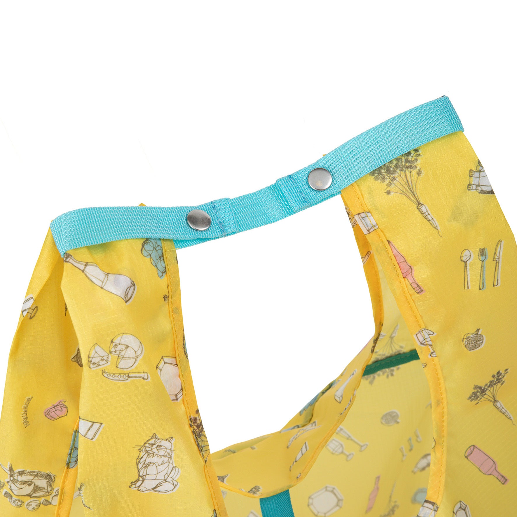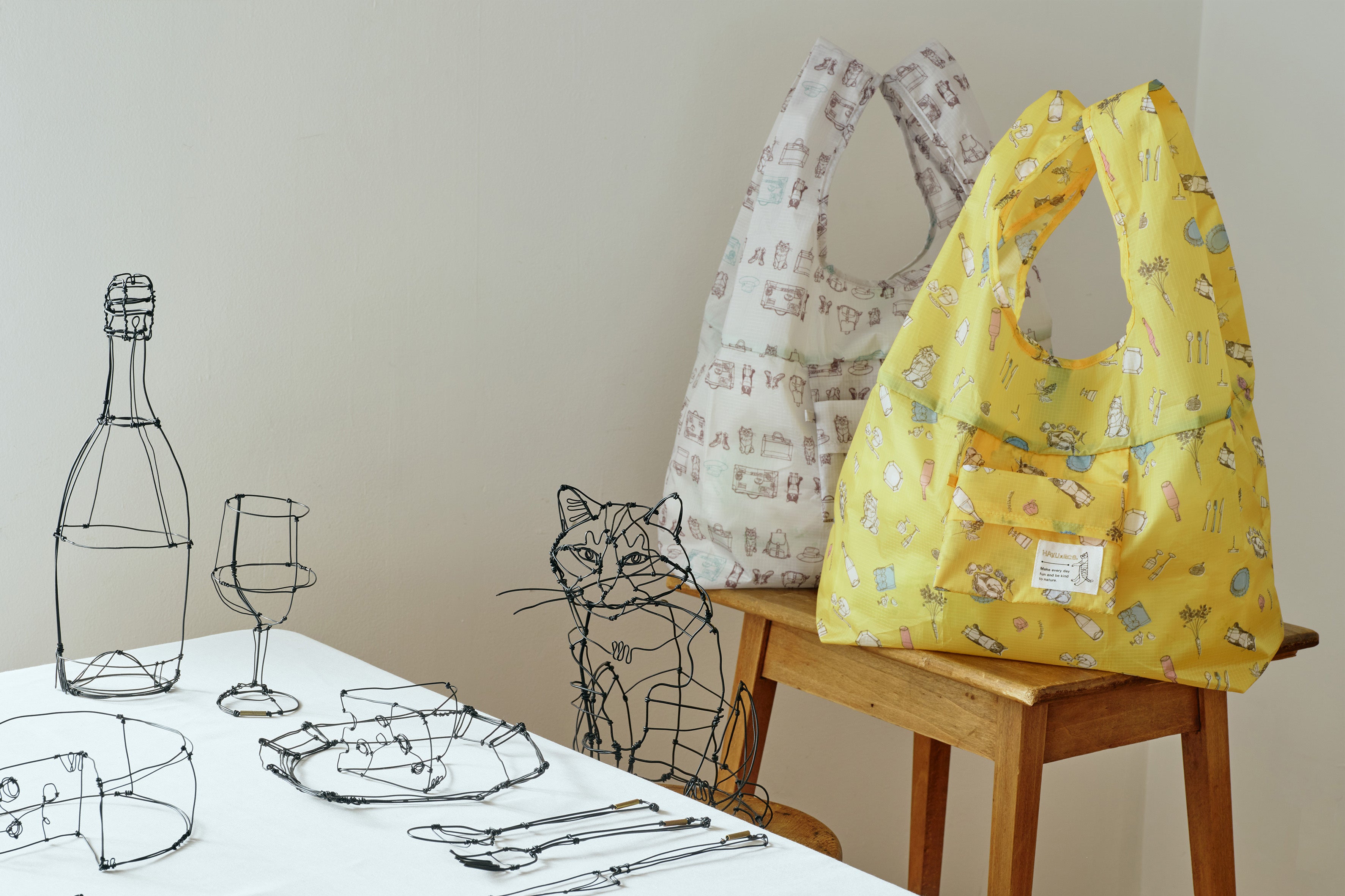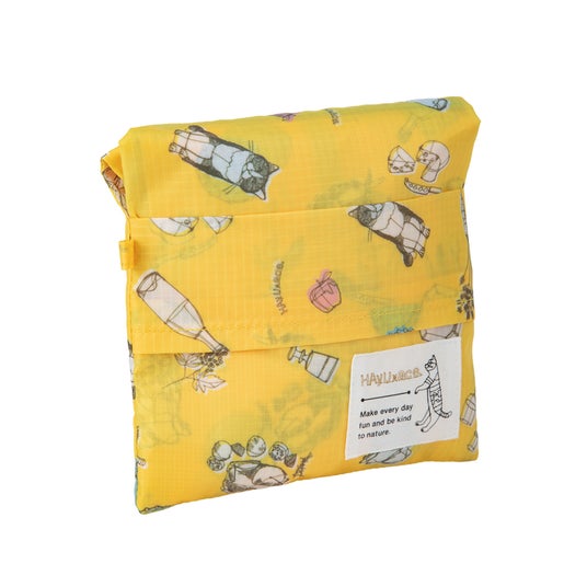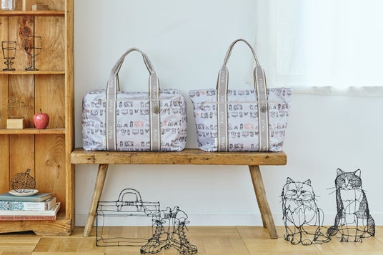 大きく開いて荷物を入れやすい、オリジナル仕様(※実用新案登録済)のマルシェバッグに、新色のグレーとイエローを追加します。本体色によって、それぞれ異なる猫柄がプリントされており、グレーには「ネコと旅バッグ」、イエローには「ネコとフード」をモチーフにしたプリントを施しています。