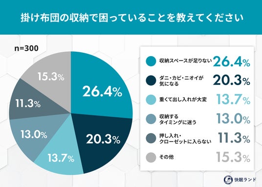 - 7割以上(71.6%)が掛け布団の収納に悩みあり- 困りごとの上位は「スペース不足」(26.4%)と「衛生面への不安」(20.3%)
