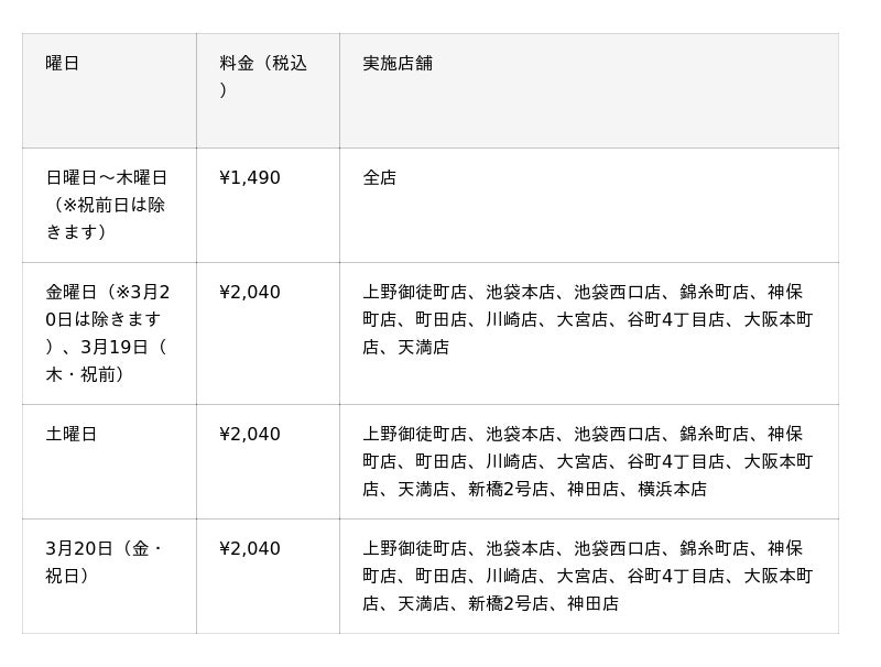 ・上野御徒町店、池袋本店、池袋西口店、錦糸町店、神保町店、町田店、川崎店、大宮店、谷町4丁目店、大阪本町店、天満店は¥1,930(税込)で金曜、土曜、祝前日も開催します