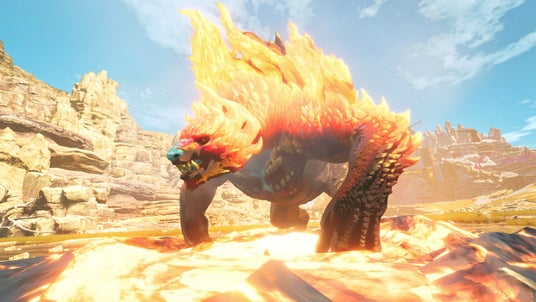 背中を覆うように発達した甲殻が特徴的な牙獣種。溶けた金属を身体に付着させ、何度も擦り合わせることで自身に熱を蓄積し、爆発を引き起こす。別名「赫猿獣」。高温状態は、身体に付着させた金属を擦り合わせた摩擦熱の蓄積で起こると推測されている。特に高温となる肩の甲殻部分は通常の弾や矢、接触した地面までをも溶かすほどである。