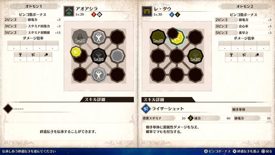 今作では、絆遺伝子を選ぶ際、絆遺伝子の一覧から選ぶこともでき、手持ちに目的の絆遺伝子を持つオトモンがいない場合、該当するモンスターを「フィールドから探す」ことができるようになった。さらに、「伝承の儀」によってオトモンや絆遺伝子が失われることはないので、色々な絆遺伝子の組み合わせを、気軽に試せるようになっている。
