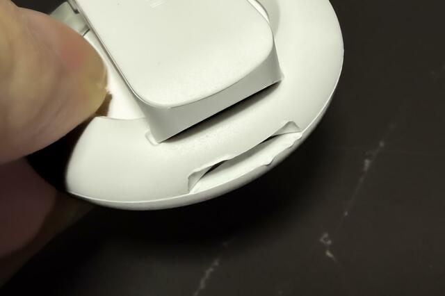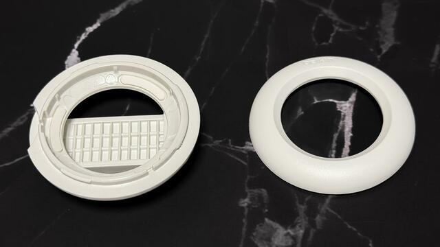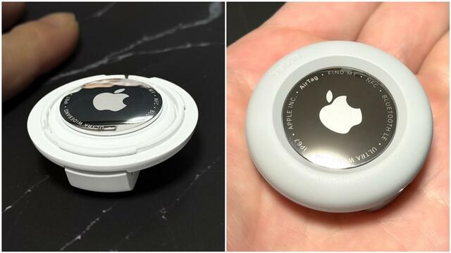 使い方は、まずベースパーツの中央にAirTagをのせ、その上からもう一方のリング状パーツを被せます。