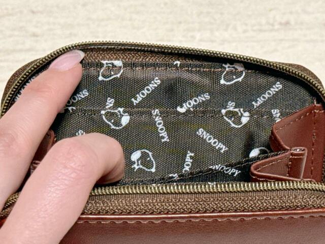 ファスナーの引き手にはチャーム付きで、スヌーピーの肉球の刻印が入っています。カラーはアンティークゴールドで大人っぽく、ここがまた高見えポイント。開け閉めするたびに気分が上がります。