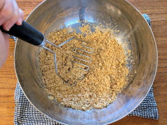 2.マッシャーで大豆をなめらかになるまでつぶす