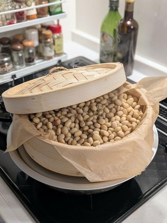 1.水を吸った大豆をやわらかく蒸す(30〜40分)