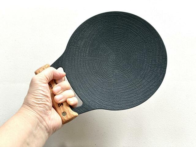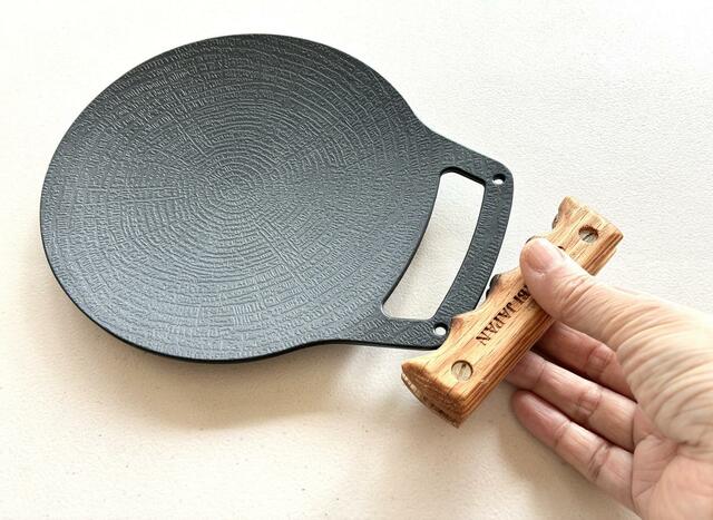 熱々のグリドルをテーブルに移動したい場合などに重宝する木製グリップが付属しています。