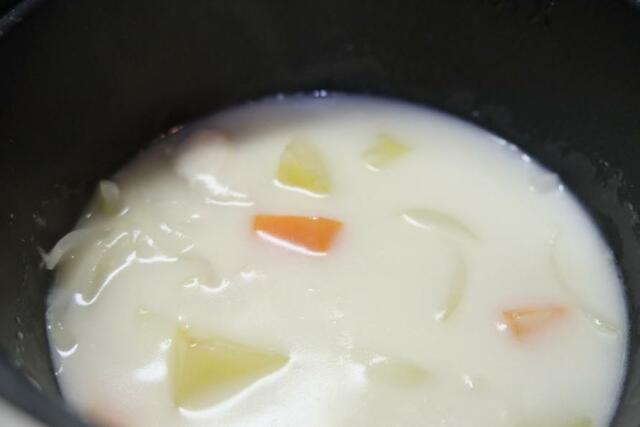 いったん取り出して、細かく刻んだルーを加えてよく混ぜ、さらに3分ほど加熱すると、シチューが完成〜!