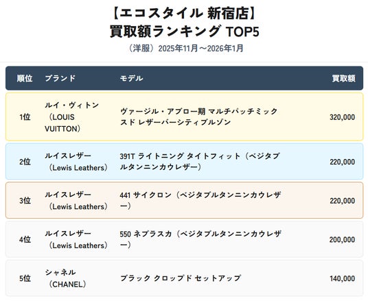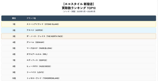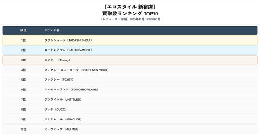 株式会社スタンディングポイント(本社:東京都目黒区、代表取締役:若森 寛)が運営するブランド買取専門店「エコスタイル新宿店」は、2025年11月から2026年1月における洋服の買取実績をもとに、ブランド別ランキングを集計・発表しました。本リリースでは、メンズ・レディースそれぞれの買取数ランキングTOP10に加え、期間中の買取額ランキングTOP5を公開し、新宿エリアにおけるファッションリユース市場の最新動向をお知らせします。