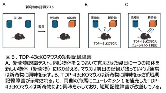 そして、ニューレキシン1をTDP-43cKOマウスのニューロンに補充すると髄鞘が有意に回復することもわかりました(図5)。 さらに、TDP-43cKOマウスでは短期記憶障害を認めましたが、両側の海馬のニューロンにニューレキシン1を補充したマウスでは記憶障害の改善がみられました(図6)。