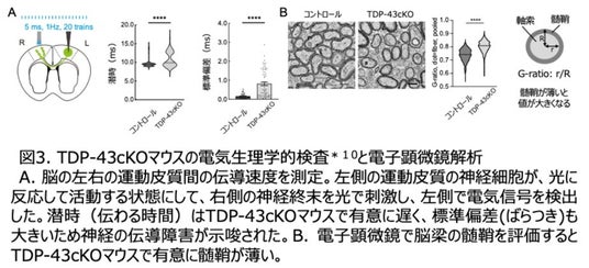 ・神経細胞(ニューロン)特異的にTDP-43*1をノックアウト*2したマウスの脳において軸索*3の髄鞘化*4が抑制されていることを発見