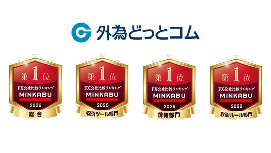 株式会社外為どっとコム(本社:東京都港区、代表取締役社長:竹内 淳)は、株式会社ライブドアが運営する「MINKABU(みんかぶ)」(https://fx.minkabu.jp/)のFX会社比較における2026年の年間ランキングにおいて、「総合・取引ツール・配信情報・取引ルール」の4部門にて1位を獲得いたしましたのでお知らせいたします。※ライブドア調べ(2025 年 12 月時点)
