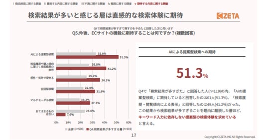本調査内で「ECサイトを離脱した理由」に関して「検索結果が多すぎて探すのをやめた」と回答したうち、「AIの提案型検索」に期待していると回答したのは51.3%、「検索履歴‧閲覧傾向による表示」と回答したのは41.2%という結果となりました。