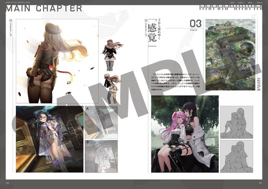 本書は、そうした『NIKKE』の世界観を資料集としてまとめた一冊です。アークや三大企業といった舞台設定をはじめ、メインチャプターやイベント、ニケ、ラプチャーに関する設定を、ビジュアルを中心に収録しています。開発段階で描かれた貴重なラフスケッチや設定テキスト、スタッフコメントなども掲載されており、制作の背景を知ることができる内容となっています。