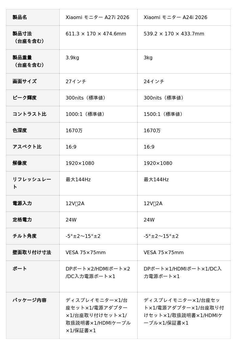 ■「Xiaomi モニター A27i/A24i 2026」の製品特長
