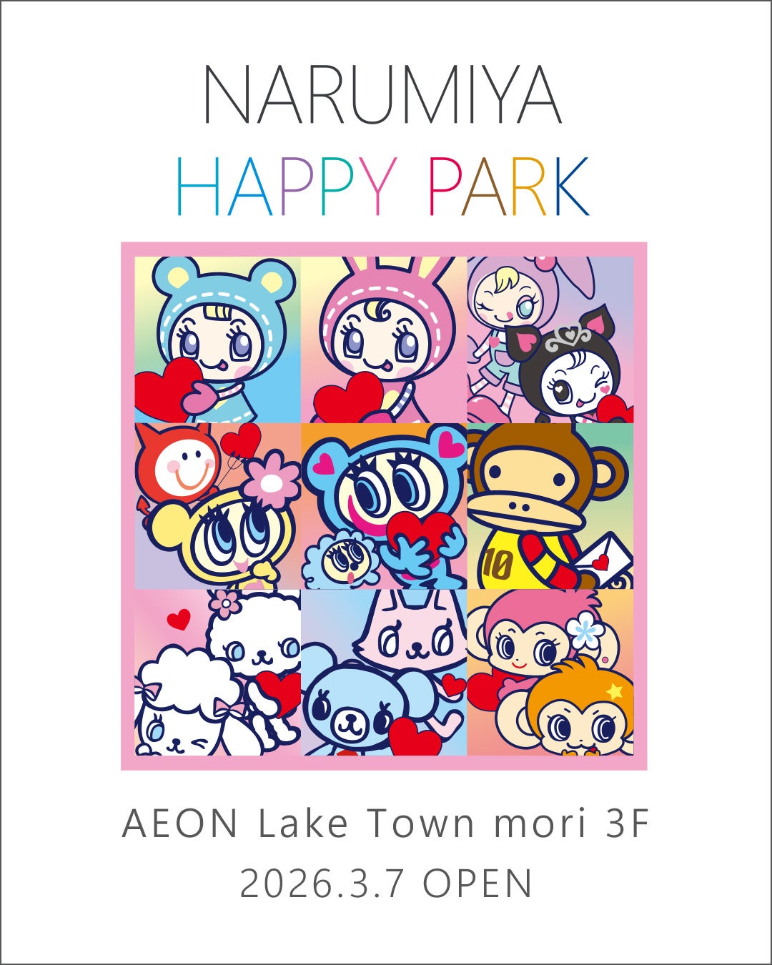 株式会社ナルミヤ・インターナショナル(本社:東京都港区、代表取締役社長執行役員:國京紘宇)は、ルミネエスト新宿(東京)に次ぐキャラクターIPに特化した「NARUMIYA HAPPY PARK(ナルミヤ ハッピーパーク)」を、2026年3月7日(土)にイオンレイクタウンmori(埼玉)にオープンいたします。