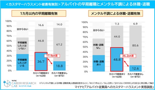 アルバイト従業員の1カ月以内の早期離職の有無をみると、カスタマーハラスメント被害があった企業では「早期離職があった」割合が36.7%となり、被害がなかった企業と比べて17.9pt高い結果となった。