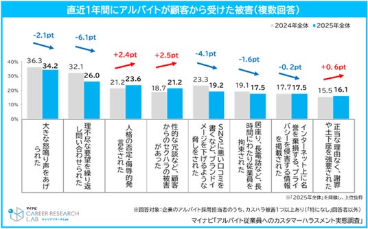 一方で「性的な冗談など、顧客からのセクハラ被害があった(前年比2.5pt増)」や「人格の否定・侮辱的発言をされた(前年比2.4pt増)」は前年から増加した。