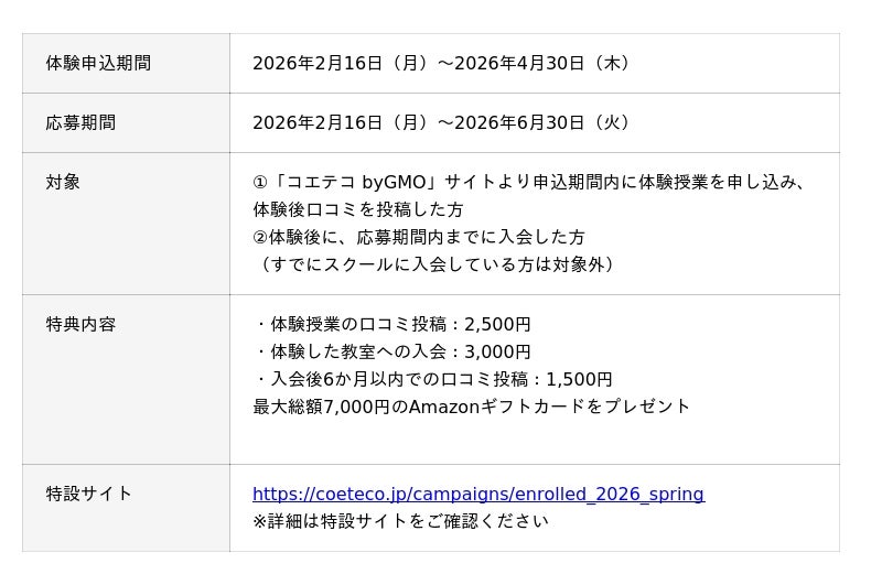 「コエテコ byGMO」では、2026年2月16日(月)より「2026年春の入会キャンペーン!最大7,000円分Amazonギフトカードプレゼント!」を実施しています。本キャンペーンでは、「コエテコ byGMO」からプログラミングスクールの体験授業を申し込み、体験後に口コミを投稿し、期間内に体験したスクールへ入会された方を対象に、最大総額7,000円分のAmazonギフトカードをプレゼントします。
