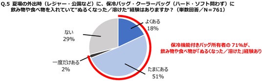 同調査において、保冷機能付きバッグを所有している人を対象に「夏場の外出時(レジャー・公園など)に、保冷バッグ・クーラーバッグ(ハード・ソフト問わず)に飲み物や食べ物を入れていて、“ぬるくなった/溶けた”経験はありますか?」と質問したところ、71%が経験あることが判明しました。