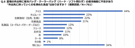 さらに、「夏場の外出時に、保冷バッグ・クーラーバッグ(ハード・ソフト問わず)の保冷機能に不安を感じ、“外出先に持っていくのを諦めた食品”はありますか?」という質問では、「アイス」「チョコレート」「生鮮食材」の順で多い結果となりました。