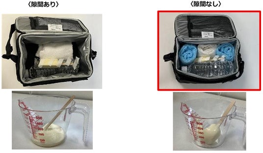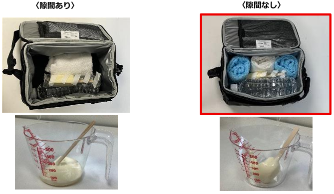 そうすることで、バッグ内の空気の対流を抑えることができ、保冷効果の持続につながります。当社が室温35℃の環境下で行った実験(※)でも、保冷バッグ内の「隙間」が保冷力を大きく左右することが分かりました。バッグ内に空間がある状態〈左図:隙間あり〉では、アイスの原型がないほど溶けた状態に。一方、タオル等で隙間を埋めて中身を密にした状態〈右図:隙間なし〉では、アイスは一部溶解にとどまり形状を維持しました。冷えたペットボトルやタオル、新聞紙などを活用し、できるだけ隙間をなくして詰めることが、保冷効果を長持ちさせるポイントです。