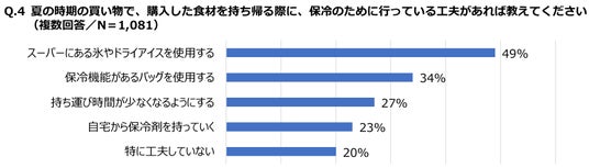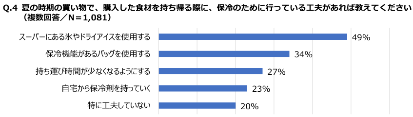 さらに、夏の買い物において購入した食材を持ち帰る際に、何らかの保冷対策を行っている人は全体の80%に達しました。これらの結果から、夏場の食品管理に対する意識が高まっていることが分かります。
