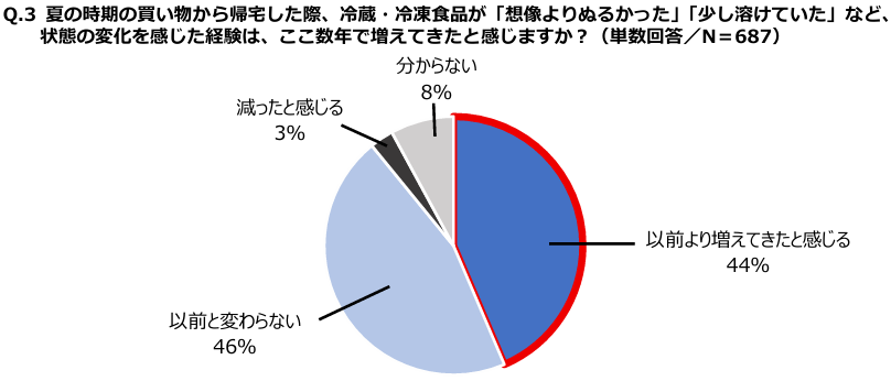 同調査より、夏の買い物から帰宅した際に、冷蔵・冷凍食品が「想像よりぬるかった」「少し溶けていた」など、状態の変化を感じた経験がある人は全体の64%にのぼりました。そのうち44%が、こうした経験について「以前より増えてきた」と感じていることが分かりました。