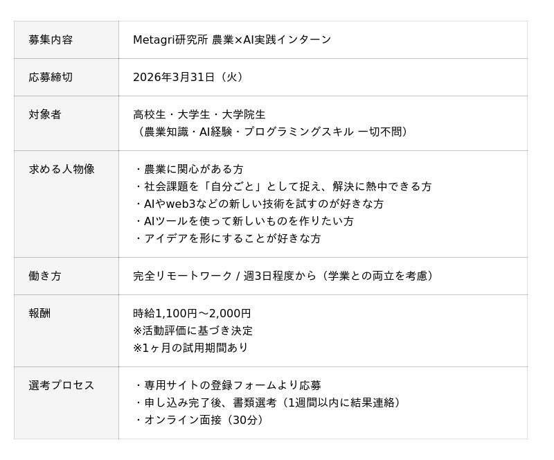この取り組みをさらに拡大するため、農業現場と生成AIの間をつなぐ「橋渡し役」となるZ世代の実践型インターンの募集を開始します。