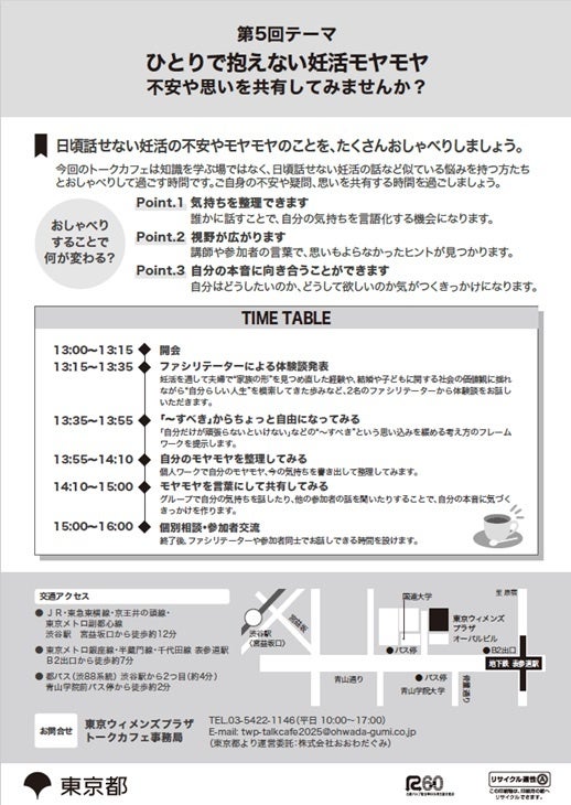 【問合せ先】:東京ウィメンズプラザトークカフェ事務局(株式会社おおわだぐみ内)