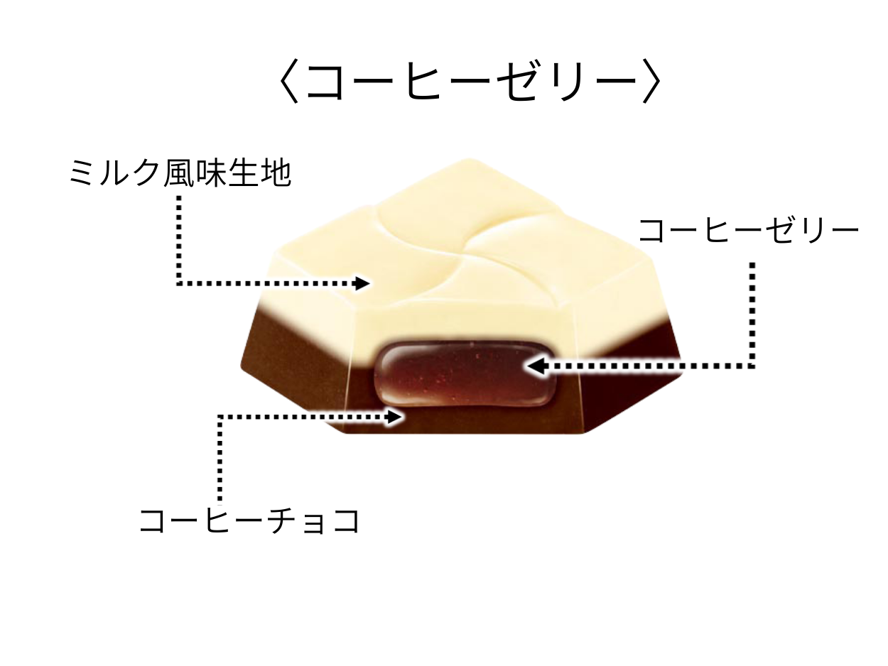 特長でもあるミルクの優しい甘みとコーヒーのビターな風味を2層の生地で再現しています。センターにコーヒーゼリーを閉じ込めることで噛んだ時にぷるぷる食感が口いっぱいに広がります。