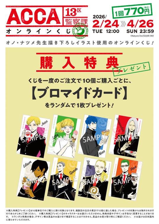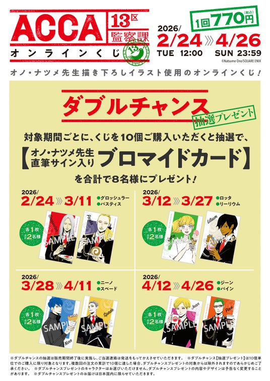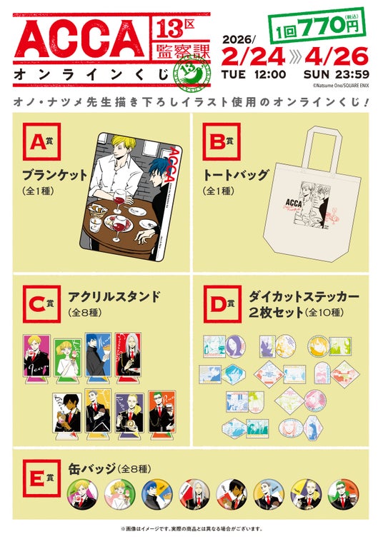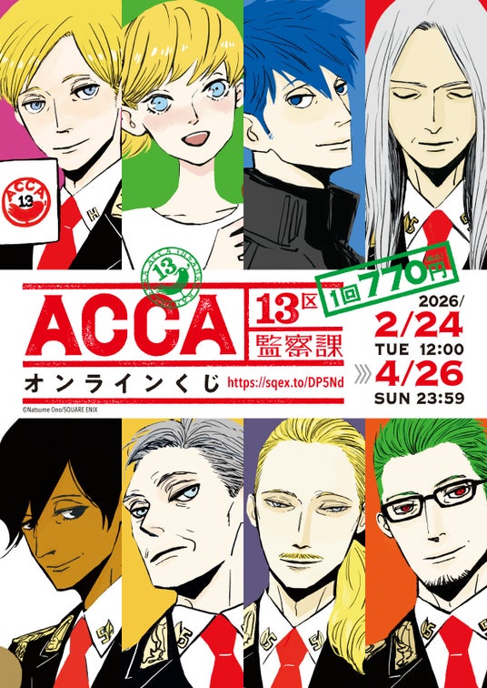 本日2026年2月24日正午より、スクウェア・エニックス e-STOREにて「ACCA13区監察課」(オノ・ナツメ先生)のオンラインくじの予約受付が開始いたしました。