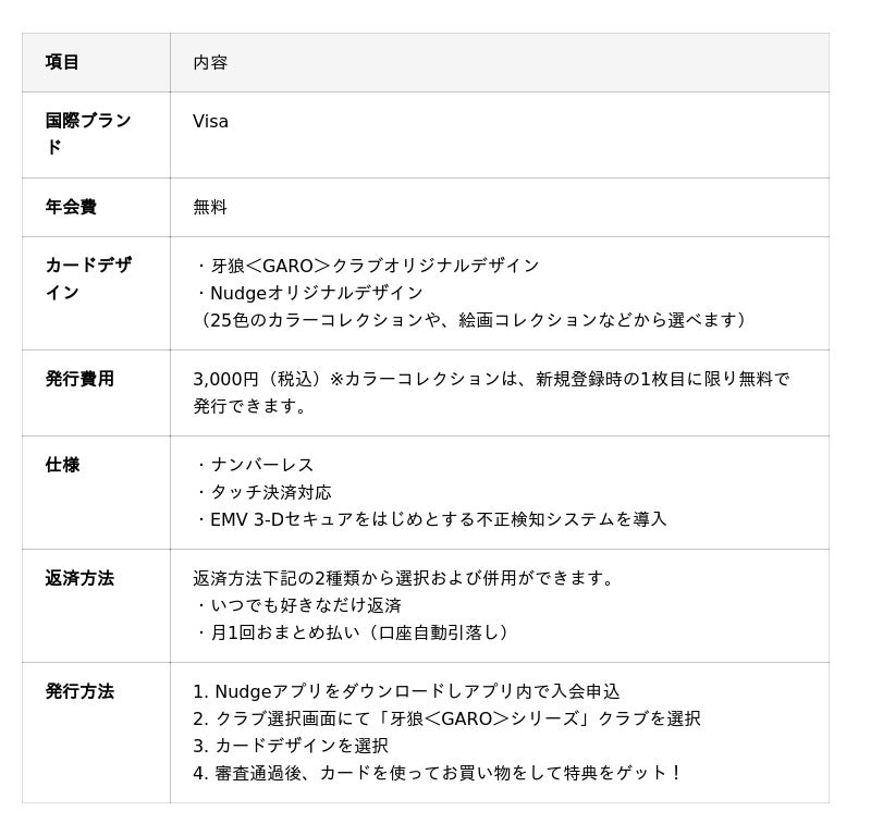 本カードは、日常の買い物を通じて「牙狼<GARO>シリーズ」を応援できる仕組みで、カードの月次利用額に応じて「牙狼<GARO>シリーズ」が提供する限定特典や、オリジナルデザインカードをお楽しみいただけます。