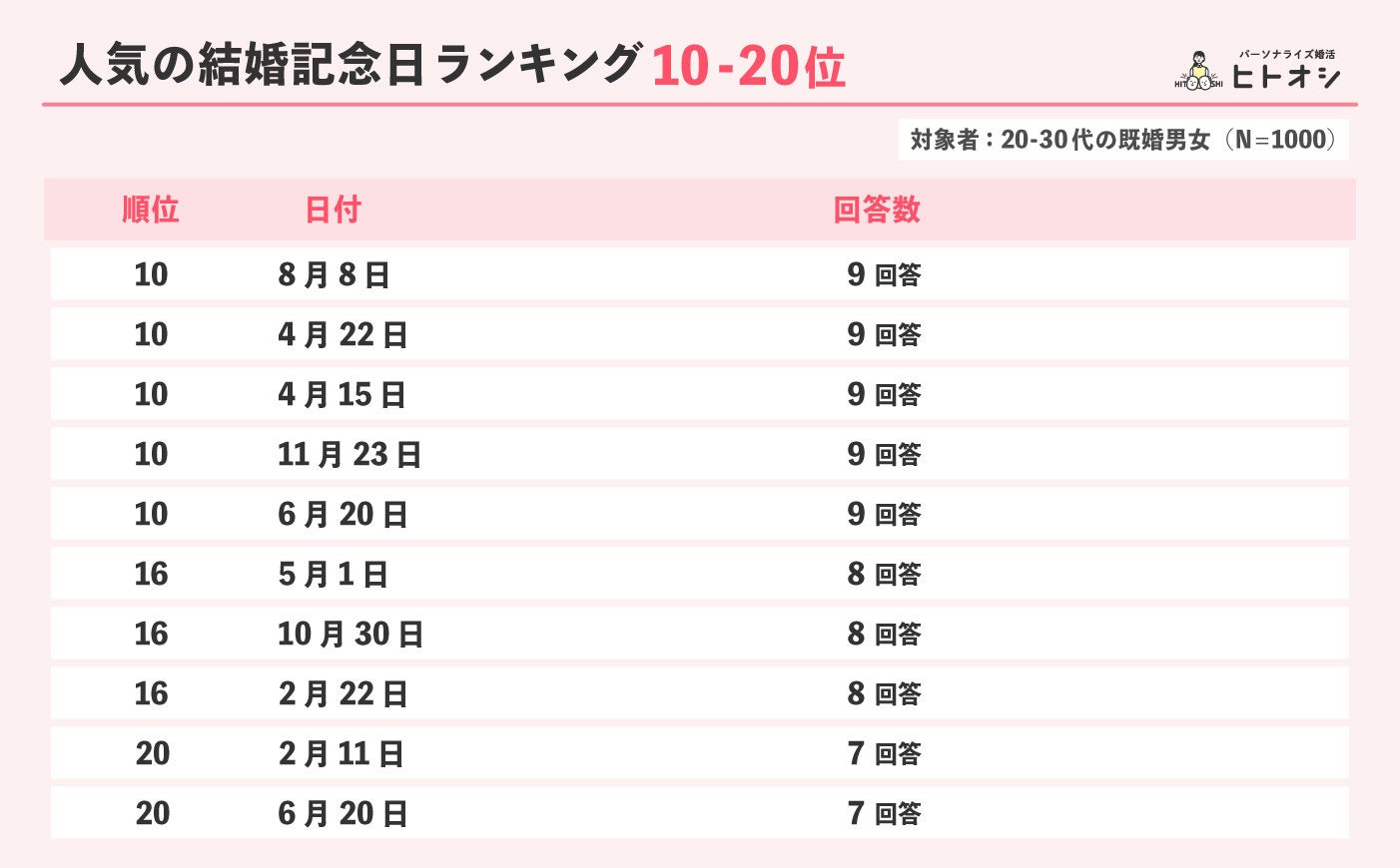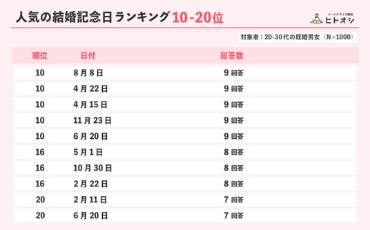 婚活のマッチングサービス「ヒトオシ」を運営する株式会社Parasol(本社:東京都港区、代表取締役社長:伊藤早紀)は、20代・30代の既婚者男女1000人を対象に「結婚記念日」に関するインターネット調査を実施しました。