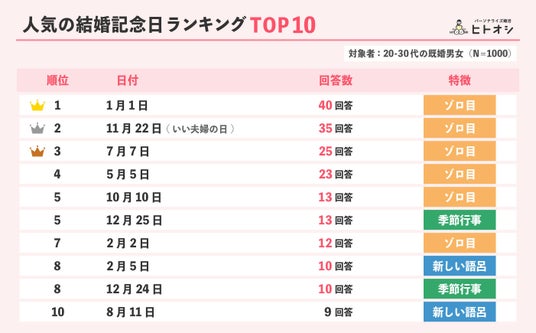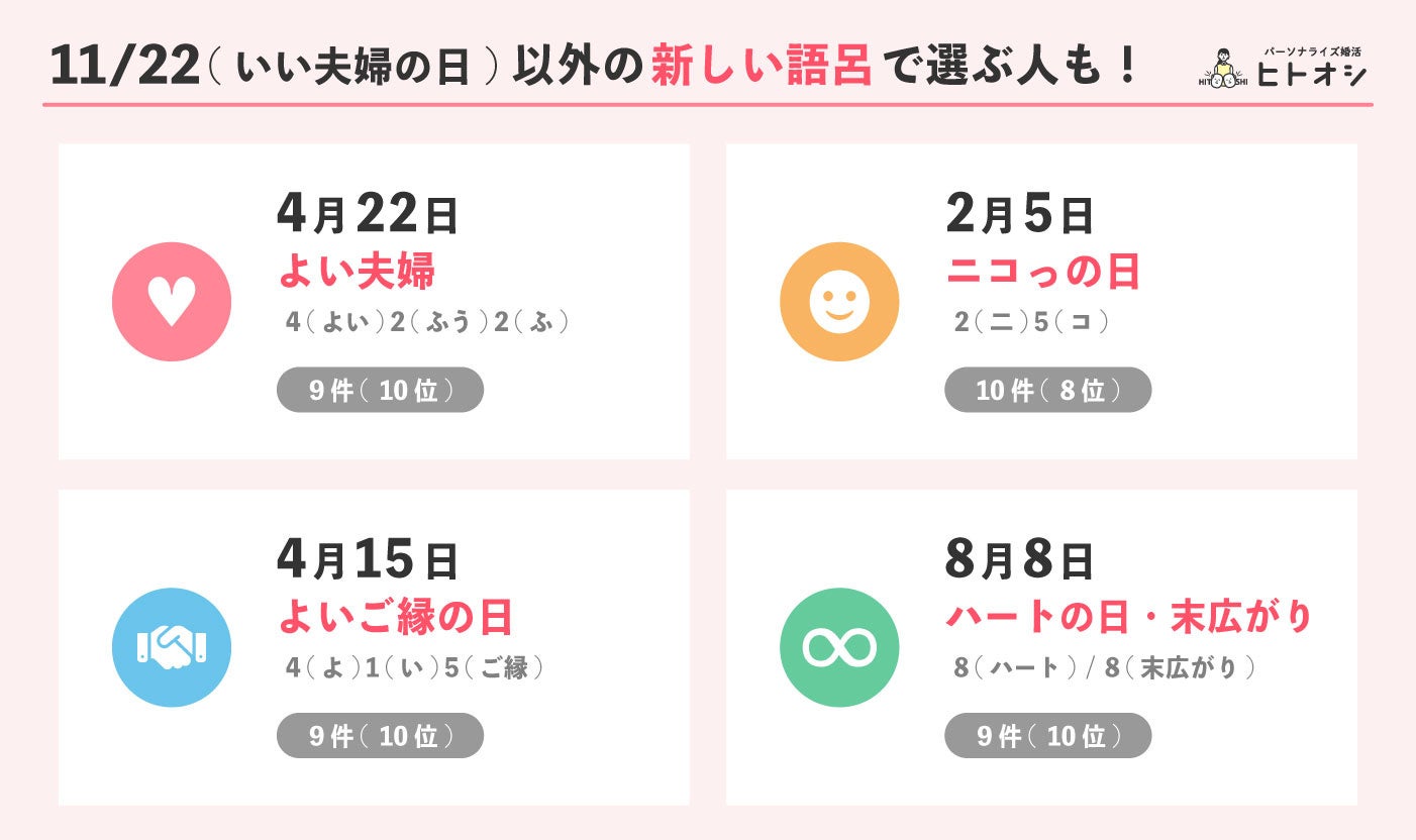 一方で、「11月22日(いい夫婦の日)」といった定番の語呂合わせに加え、トップ10には「2月5日(ニッコリの日)」など、新しい語呂合わせの日付もランクインしました。従来の定番にとらわれず、自分たちらしい意味を込めた日を選ぶ選択肢が、少しずつ広がりつつあることが読み取れます。