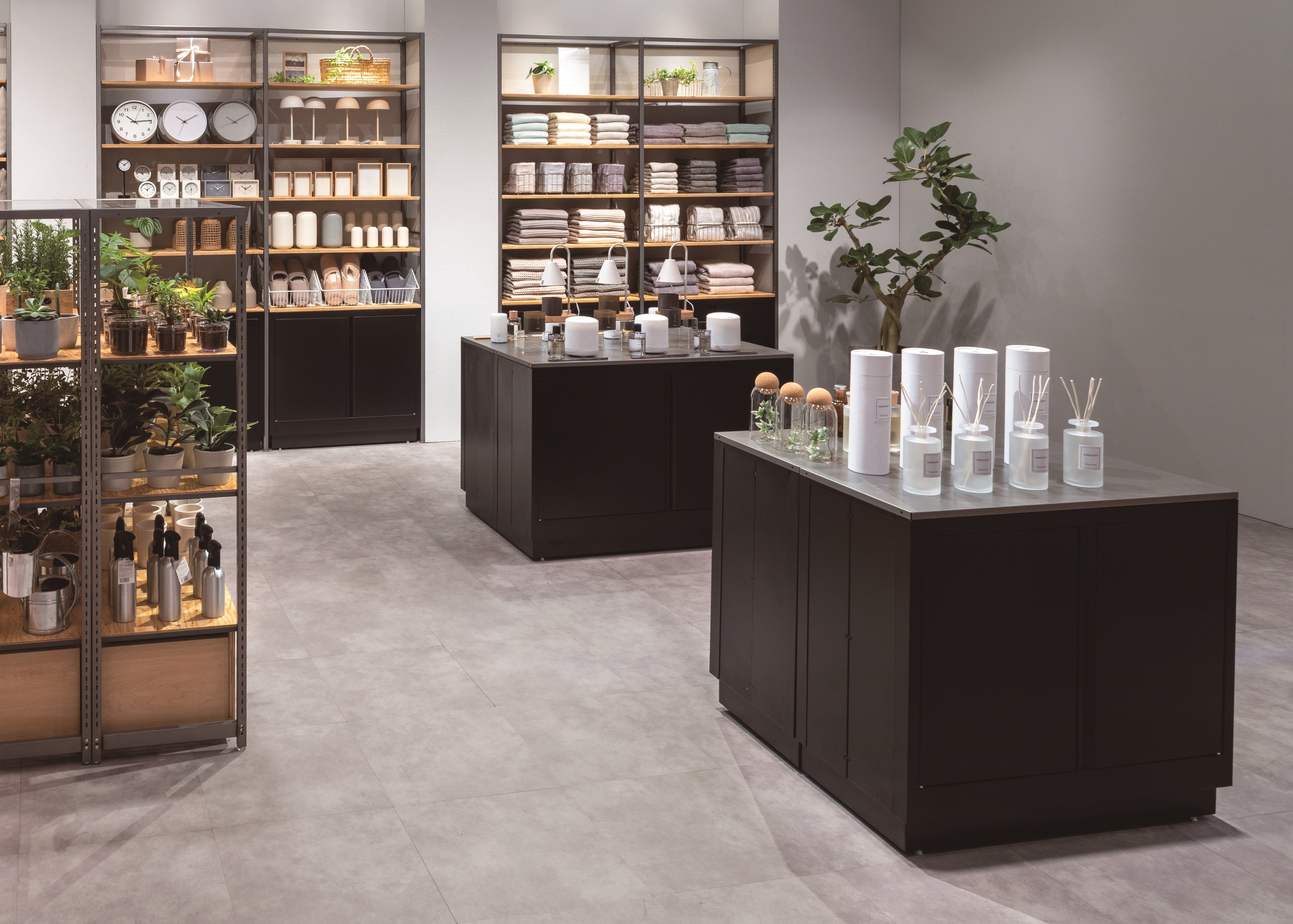 - 雑貨売場では、今夏発売予定の木棚の新柄バリエーションを展示し、アパレル売場では、スチールクリア×ラーチ合板の統一什器を用いた上質な空間を提案