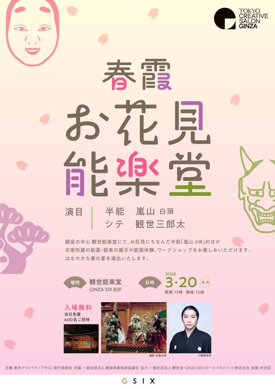 650年の歴史を持つ能楽を、身近に感じられる人気イベントが今年も開催。「能とお花見」をテーマにしたお話やワークショップ、半能「嵐山」の上演を無料で行うほか、ロビーでは能装束の展示や能面体験も。