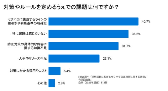 対策やルールを定めるうえでの課題についてです。「セクハラに該当するラインの線引きや判断基準の明確化」が40.7%と最も多い結果に。次いで多かった課題は「防止対策の具体的な内容に関する知識不足(31.7%)」でした。「人手やリソース不足(23.1%)」よりも、「基準の曖昧さ」や「ノウハウ不足」が大きなハードルとなっていることが推察できます。