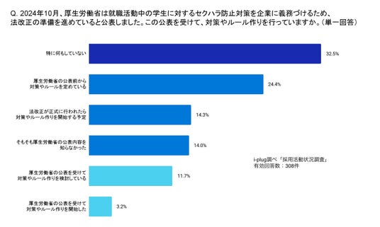 Q. 2024年10月、厚生労働省は就職活動中の学生に対するセクハラ防止対策を企業に義務づけるため、法改正の準備を進めていると公表しました。この公表を受けて、対策やルール作りを行っていますか。(単一回答)