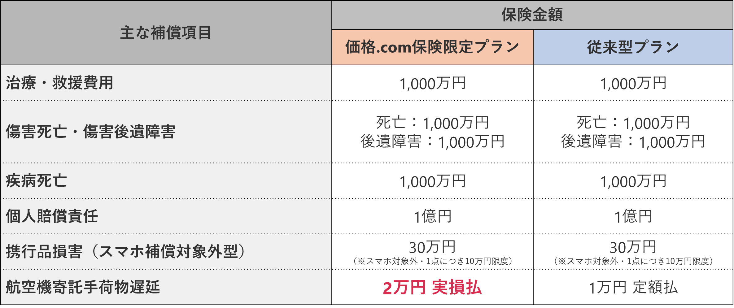 「価格.com保険」では、ニーズの高い「航空機寄託手荷物遅延」の補償を強化した、当社限定プランの取り扱いを開始します。本プランは、従来プランの「治療・救援費用(1,000万円)」や「携行品損害(30万円)」(※3)といった手厚い補償はそのままに、航空会社に預けた手荷物の到着遅延に伴う生活必需品の購入費をカバーする本補償を拡充。補償限度額を従来の「定額1万円」から「実損2万円」へと引き上げることで、より安心で充実した補償内容を実現しました。