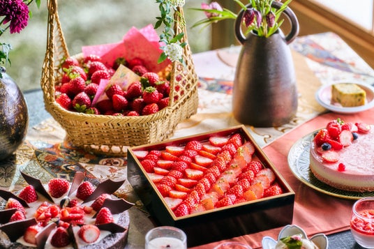 ビュッフェ台には、いちごを主役にした多彩なメニューが並びます。定番の「いちごショートケーキ」や「いちごタルト」をはじめ、フレッシュないちご2種の食べ比べもご用意。いちご本来の香りと甘みを心ゆくまで味わえます。また、「ミルフィーユパイカップ」や「ベリーティラミス」などの洋菓子に加え、いちごソースの爽やかな酸味を効かせた「あんみつ」や、とろける食感の「わらび餅」など、和の要素を取り入れたデザートもお楽しみいただけます。