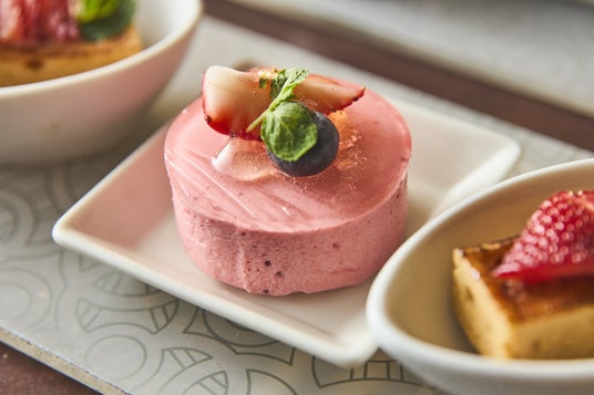 苺のムースと薔薇のジュレを重ねた二層ムースや、桜の香りをまとわせた苺と桜のティラミスなど、春を感じさせる素材の組み合わせも魅力のひとつです。和の要素を取り入れた苺大福が、全体にやさしいアクセントを添えています。