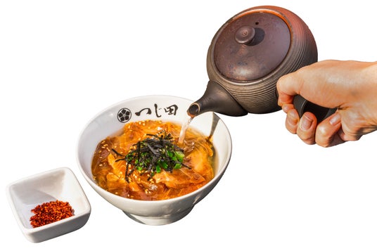 ラーメンタレに漬け込んだ真鯛の切り身をご飯の上にのせ、温かい鯛出汁をかけていただくお茶漬け風の料理。自家製唐辛子パウダーを添えて提供されます。