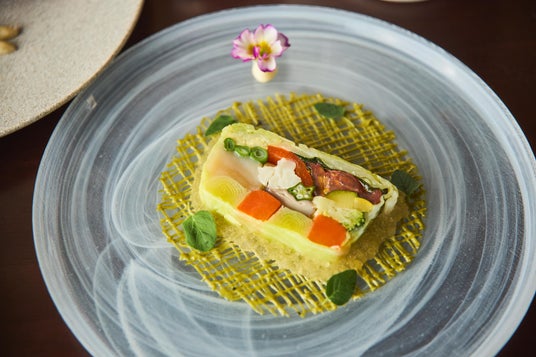 前菜は、春野菜を中心に最適な火入れを施した「彩野菜のプレッセ」。野菜の水分のみで丁寧に重ねたテリーヌに帆立を忍ばせ、コンソメジュレの旨味とオレガノの爽やかな香りを重ねました。