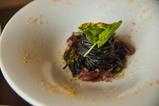 パスタには、旬のホタルイカと芹を合わせた自家製タリオリーニをご用意。イカ墨を練り込んだ生地に、からすみの塩味とバターのコク、ホタルイカの旨味を重ね、春らしいほろ苦さと力強さを併せ持つ味わいに仕上げています。