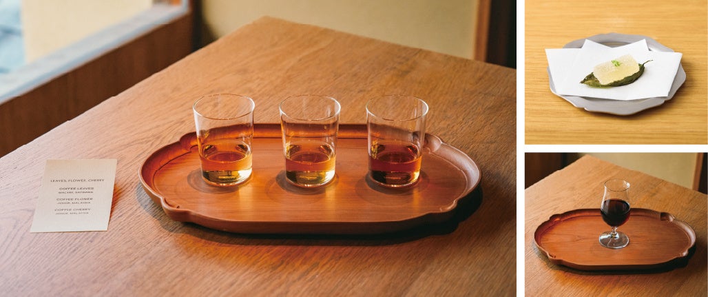 コースの幕開けには、コーヒーノキの葉・花・果実を用いたオリジナルドリンクをご提供し、普段は味わうことの少ないコーヒー植物の多様な魅力をご紹介します。続いて、自社でローストから結晶化までを手がけたエクセルサ種のインスタントコーヒーや、産地ごとの個性が際立つリベリカ種・エクセルサ種の飲み比べなど、未来のコーヒーを多角的にご体験いただけます。日本の喫茶文化に着想を得たネルドリップの濃厚な一杯、そしてスパイスを合わせたダイジェスティフでコースを締めくくります。