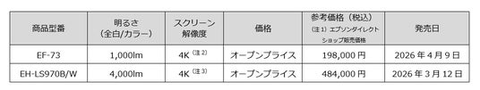 エプソン販売株式会社は、家庭用プロジェクターの新商品として、『EF-73』『EH-LS970B/W』の2機種3モデルを2026年3月12日より順次発売します。