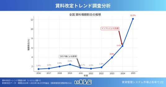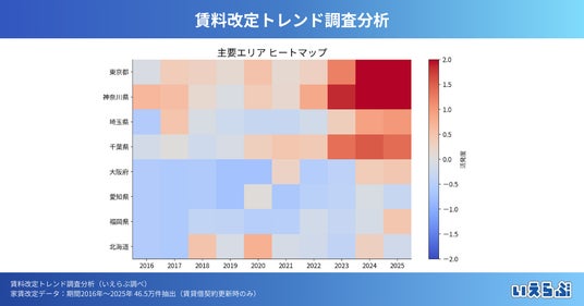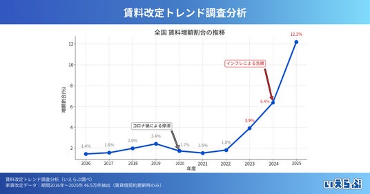 不動産業界特化のDX支援サービスを展開する株式会社いえらぶGROUP(本社:東京都新宿区、代表取締役:岩名泰介、以下「いえらぶGROUP」)は、2016年から2025年までの10年間における「賃料改定トレンド調査分析」の結果を発表します。