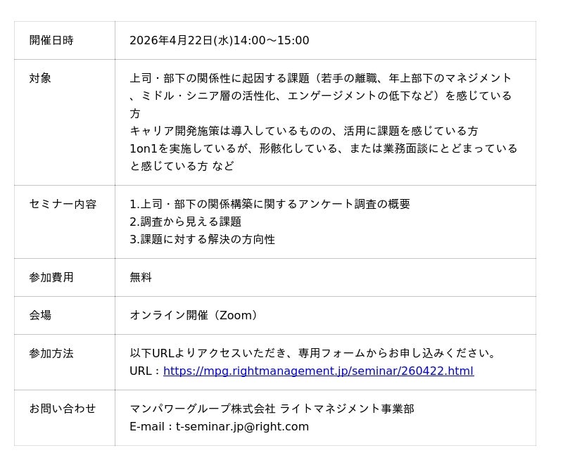 今回の調査では、上司との関係が離職理由に影響すると認識している人事・経営層が約7割にのぼり、上司・部下の関係は人材定着や組織運営に直結する経営課題であることが明らかになりました。また、上司と部下の間には信頼度や認識のギャップが存在し、形式的なコミュニケーション機会があっても、期待や評価、キャリアに関する認識のずれが十分に解消されていない状況がうかがえます。これらの結果を踏まえ、上司・部下の関係改善に向けたポイントを解説するセミナーを開催します。